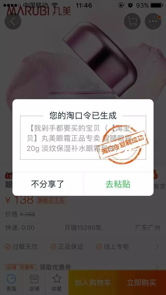先通过宝贝页面右侧的分享按钮找到【分享】入口,比如我要找这个温碧泉保湿精华水有没有优惠券